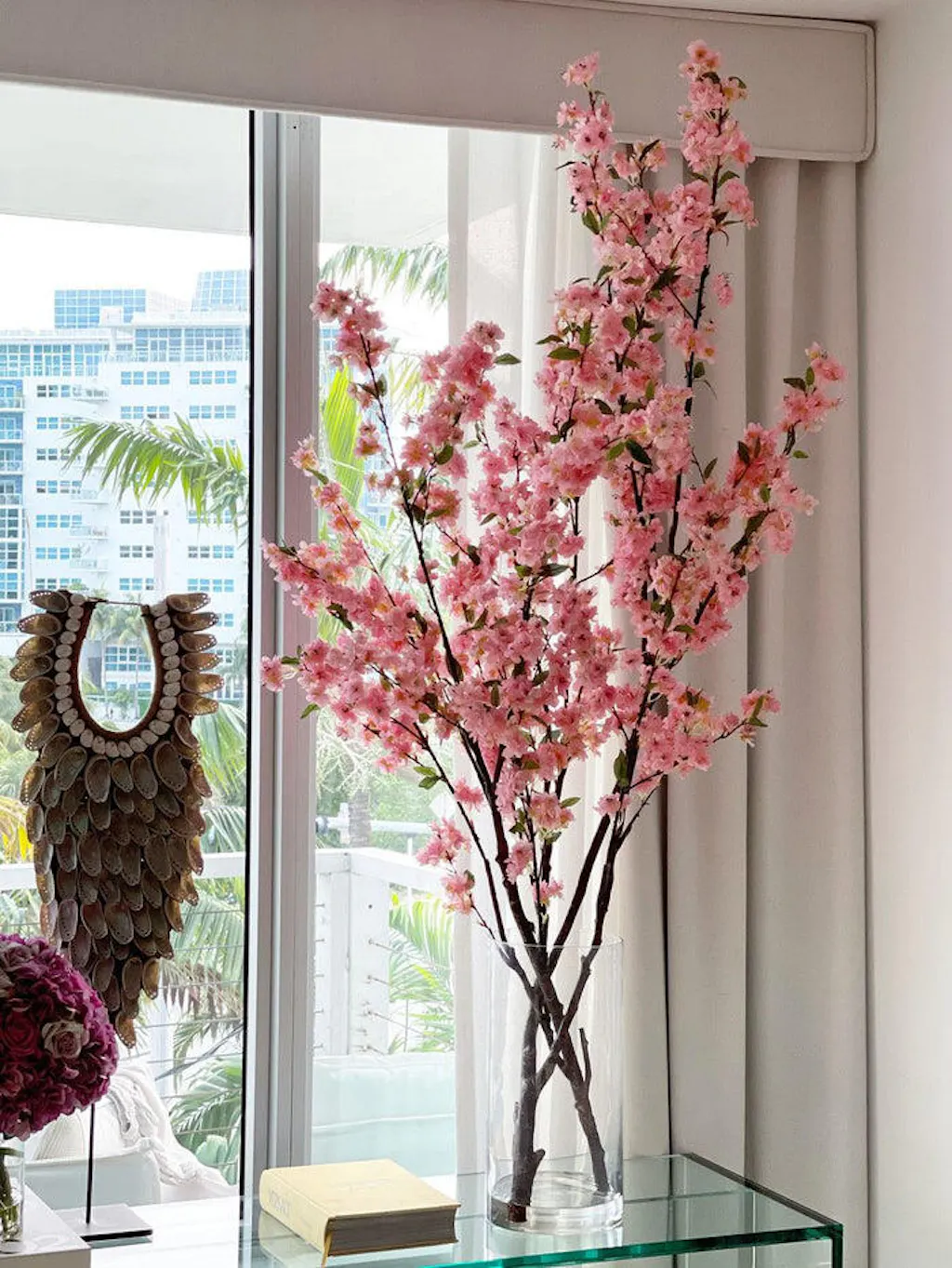 Delicate pink blooms cascade eternally from elegant natural wood branches, capturing springtime beauty year-round. The romantic flowers bring color and Japanese-inspired elegance to any space. Hand-assembled silk-polyester petals create an enchanting focal point that celebrates nature's fleeting moments, now preserved forever.